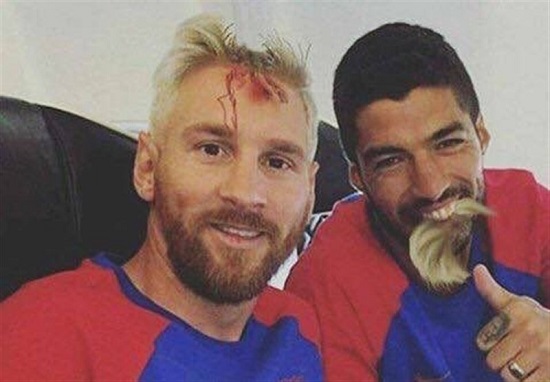 در این بین اما لیونل مسی و لوئیز سوارز، دو ستاره تیم فوتبال بارسلونا به کمک تصویرسازان (فوتوشاپ کاران) ایده جالبی را برای این شب رقم زدند. در تصویر دستکاری شده از این دو، سوارز که سابقه گاز گرفتن بازیکنان حریف را دارد با این ویژگی منحصر به فردش تکهای از موهای مسی را با دندانش کنده و از سر لئو هم خون جاری شده است.