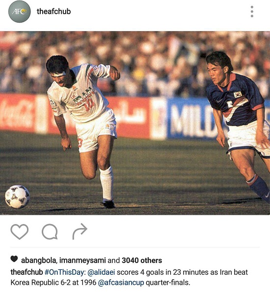 صفحه اینستاگرام AFC امروز در پستی جالب به ذکر خاطرات آن بازی پرداخت و نوشت: علی دایی با به ثمر رساندن ۴ گل در ۲۳ دقیقه مقابل کره جنوبی روزی درخشان را سپری کرد و زمینه برد ۶-۲ ایران را فراهم کرد.