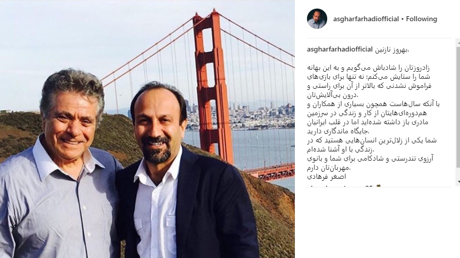 اصغر فرهادی با انتشار عکسی از خود در کنار بهروز وثوقی برای سالروز تولد او نوشت:«زادروزتان را شادباش می‌گویم و به این بهانه شما را ستایش می‌کنم؛ نه تنها برای بازی‌های فراموش نشدنى که بالاتر از آن برای راستی و درون بی‌آلایش‌تان.با آنکه سال‌هاست همچون بسیاری از همکاران و هم‌دوره‌ای‌هایتان از کار و زندگی در سرزمین مادری باز داشته شده‌اید اما در قلب ایرانیان جایگاه ماندگاری دارید.شما یکی از زلال‌ترین انسان‌هایی هستید که در زندگی با او آشنا شده‌ام. آرزوی تندرستی و شادکامی برای شما و بانوی مهربان‌تان دارم.»