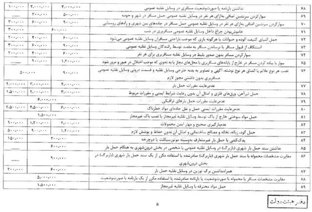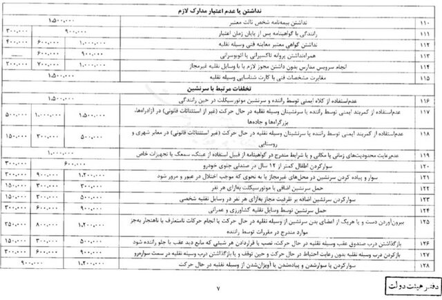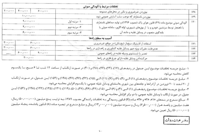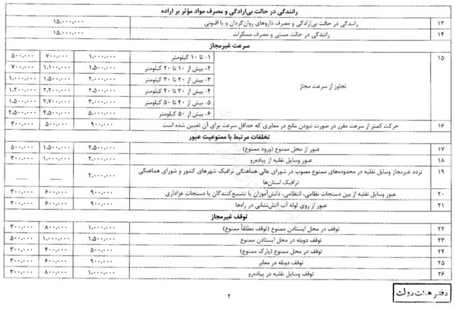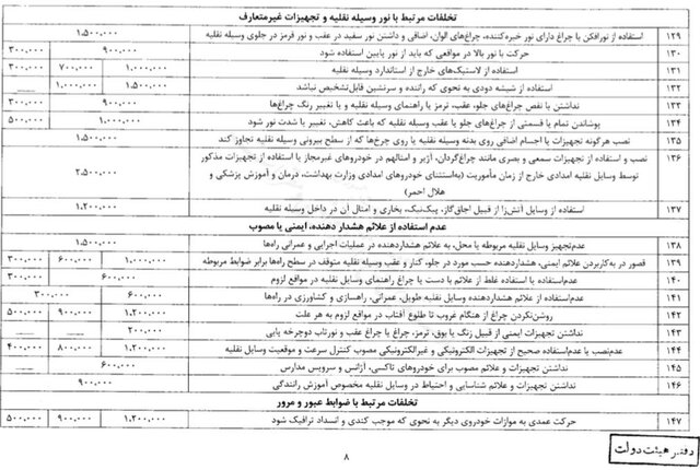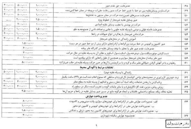 حسینی افزود: جریمهها شامل ۱۷۴ تخلف است که به سه دسته «کلانشهرها،مراکز استانها، جادههای بین شهری و مناطق آزاد صنعتی - تجاری»، «سایر شهرها» و «روستاها و راههای روستایی» تقسیم میشود.