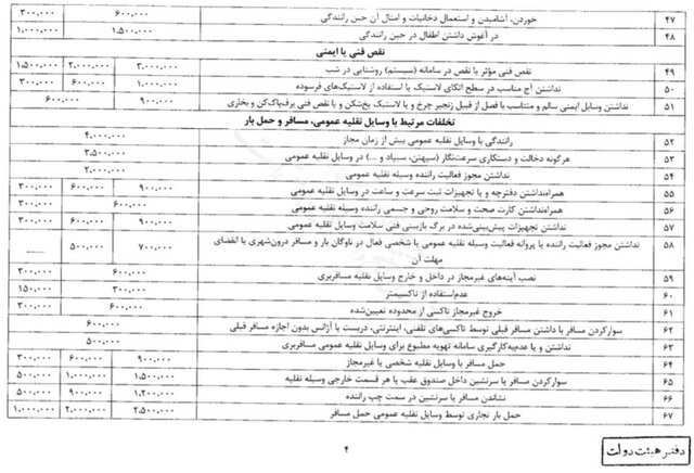 وی ادامه داد: همچنین میزان افزایش مبلغ جرائم رانندگی نیز در مورد تمام تخلفات یکسان نیست و به عنوان مثال جریمه عبور از چراغ قرمز در مراکز استانها ۴۰۰ هزار تومان است. جریمه سرعت غیرمجاز نیز از برحسب میزان سرعت از ۱۰۰ هزارتومان تا ۵۰۰ هزار تومان است.