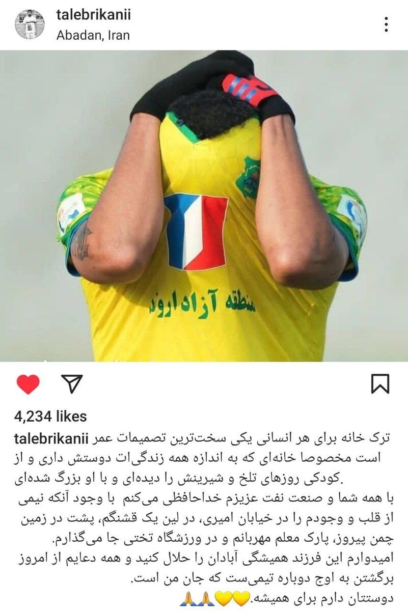 خبرورزشی: کاپیتان صنعت نفت آبادان با انتشار پیامی از جدایی خود از این تیم خبر داد.