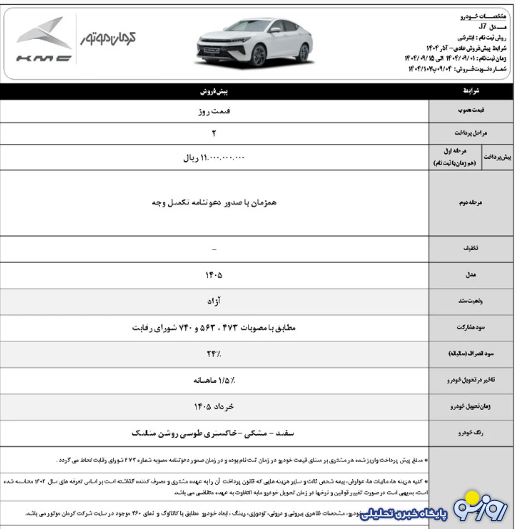 شرکت کرمان موتور شرایط پیش فروش جدید محصولات خود را با موعد تحویل خرداد ۱۴۰۵ اعلام کرد. این طرح شامل خودرو‌های کی‌ام‌سی ایگل، X۵، J۷ و پیکاپ KMC T۹ است که از اول آذر ۱۴۰۴ آغاز می‌شود.