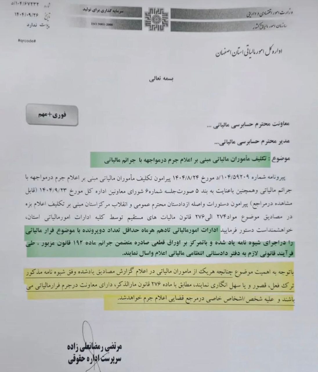 اخیراً ابلاغیه‌ای عجیب و تأمل‌برانگیز از سوی سازمان امور مالیاتی استان اصفهان منتشر شده که حواشی فراوانی به دنبال داشته و نیازمند شفاف‌سازی فوری از سوی سازمان امور مالیاتی کل کشور و وزارت اقتصاد و دارایی است.