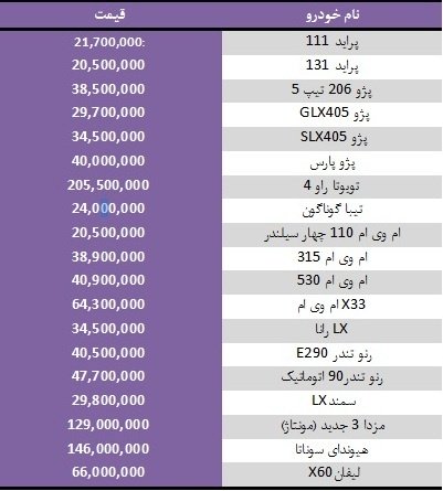 در ادامه جدول آخرین قیمت خودرو در بازار آمده است: